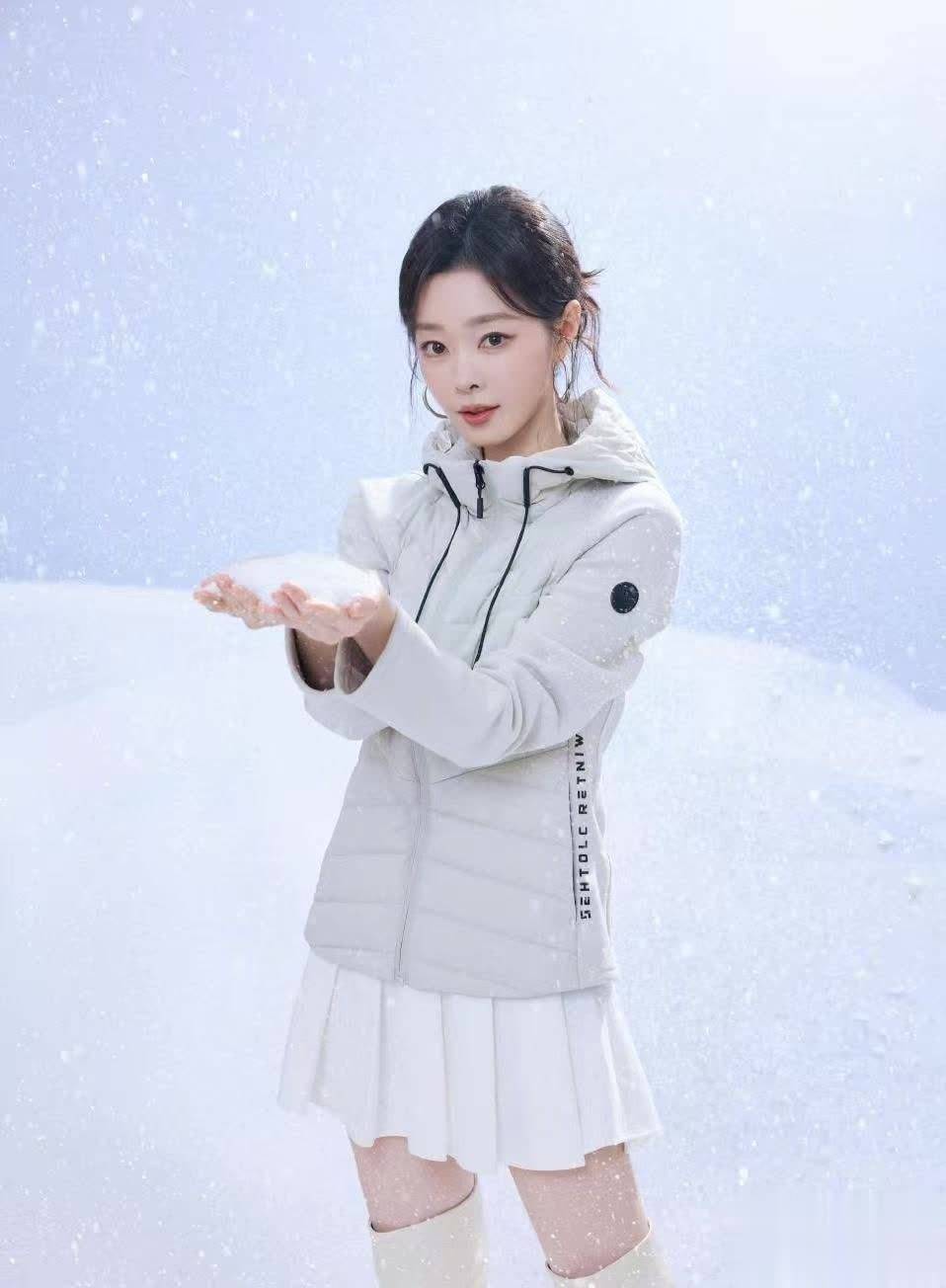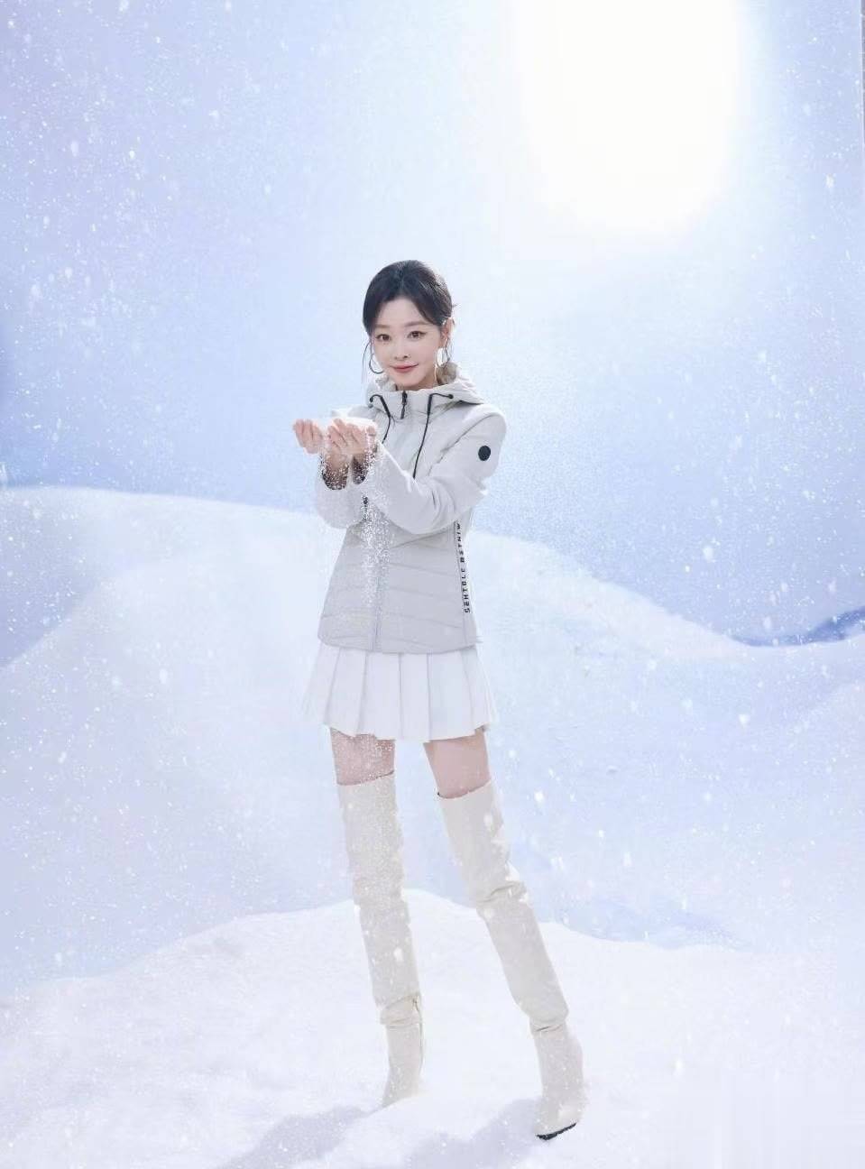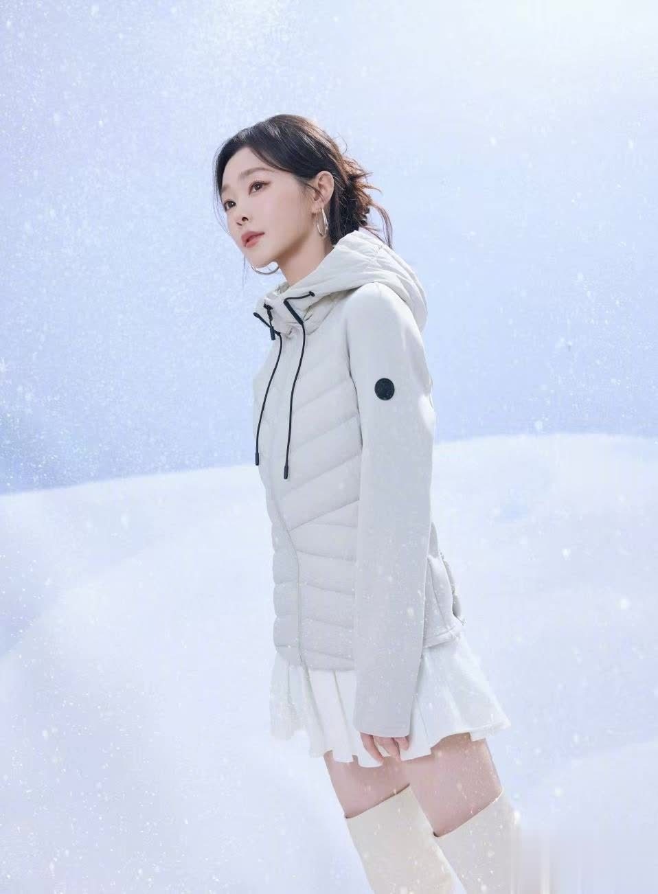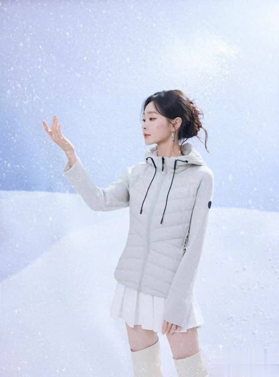 宋轶身着一袭灰色连帽短款羽绒服,下身搭配白色百褶短裙和同色长靴,露出修长双腿,青春活力扑面而来。她的头发随意挽起,几缕碎发自然垂落,侧身而立时眼神沉静,仿佛置身静谧冰雪世界。这张图凸显了宋轶的清冷气质,让人不禁感叹:不愧是“冰雪女王”!