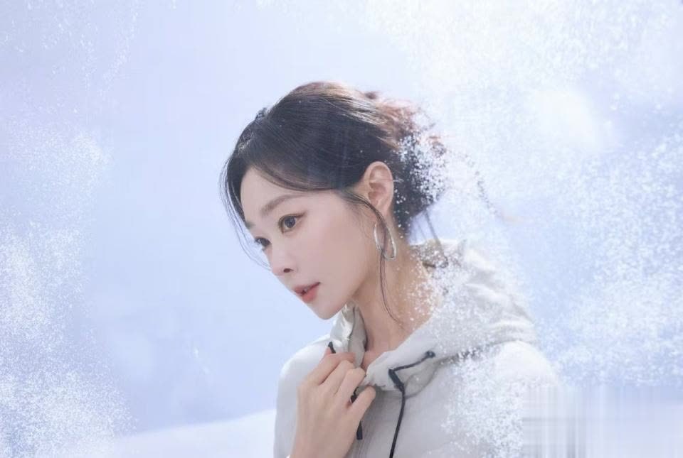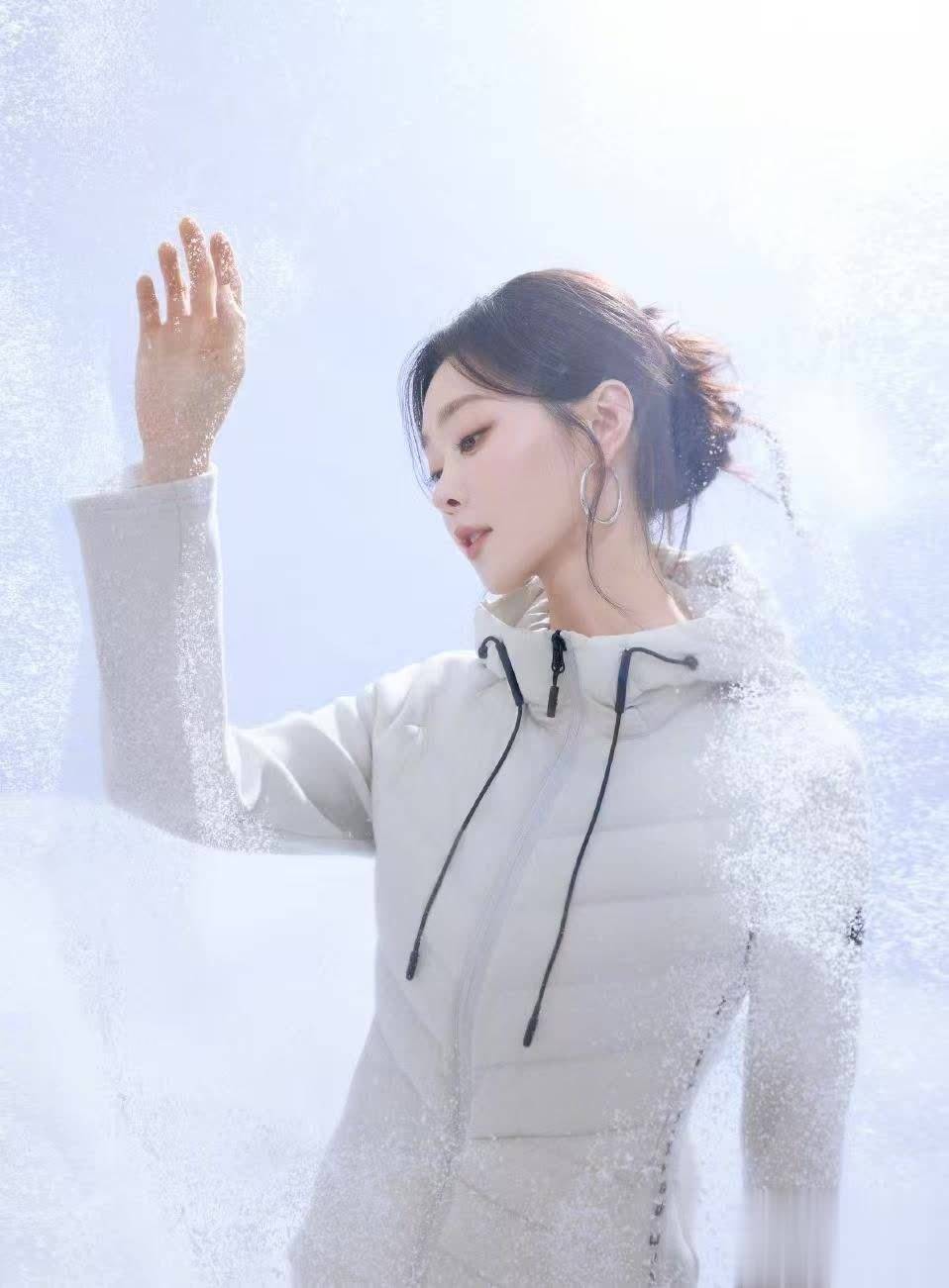 雪花落在她的肩头和发间,更显柔美。她轻拉羽绒服的领口,动作优雅又自然。那对银色的大圈耳环,在冬日氛围里格外亮眼,为整体造型增添了一丝精致感。